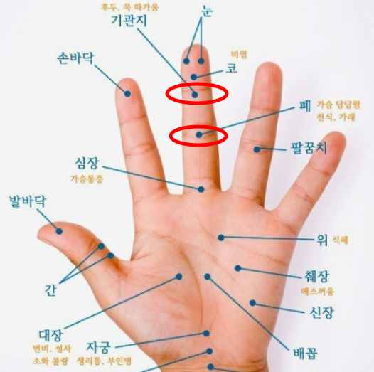 붉은 색 원 표시한 부분이 기관지/폐 위치이며 해당 부위에 자극을 주면 됨