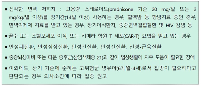 만 6개월~4세 영유아 (2018년생~2022년 8월생, 2023년 2월 기준)을 대상으로, 고위험군에게는 특히 적극 권고한다고 밝혔습니다.