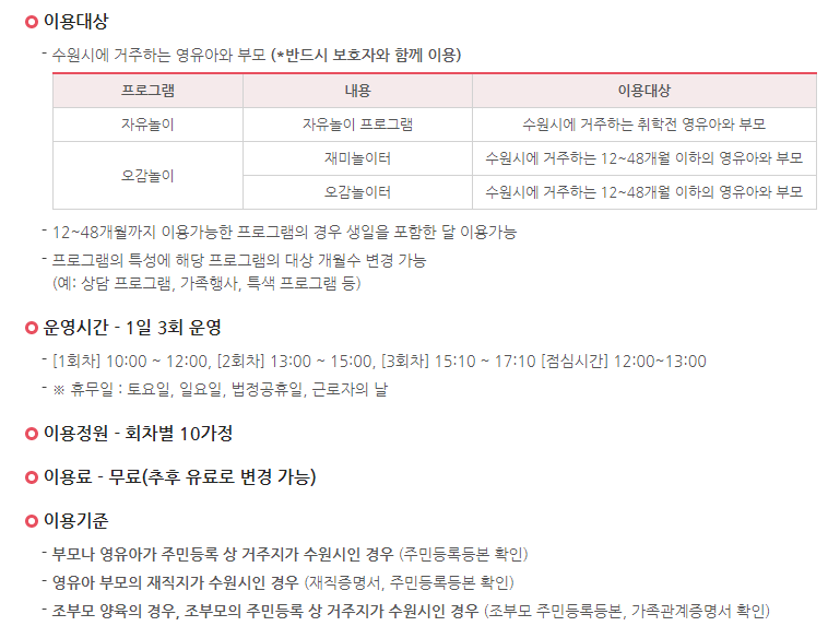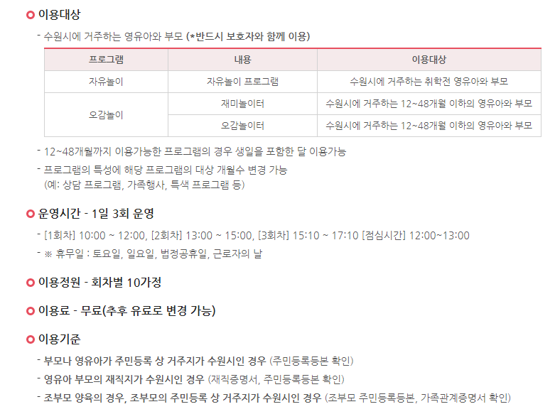 * 다른 아이러브맘카페에 비해 규모가 작음 * 탈것 놀이장난감 보다는 작은 장난감등 소근육 발달을 집중하기에 좋음 * 화성행궁 바로 옆에 위치하기 때문에 화성행궁에서 뛰어놀다가 타임에 맞춰 들어와서 놀이하기 좋음 * 주차장 없어 보임..(?)