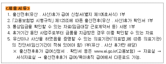 ※ 출산전후휴가 급여신청서 ․ 확인서 등은 www.ei.go.kr (고용보험) → 자료실 → 서식자료실 → 출산전후휴가 급여/육아휴직 급여에서 다운로드 가능.