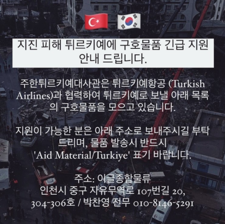 물품 발송 시 “AID MATERIAL/TURKIYE"로 반드시 표기해주세요.